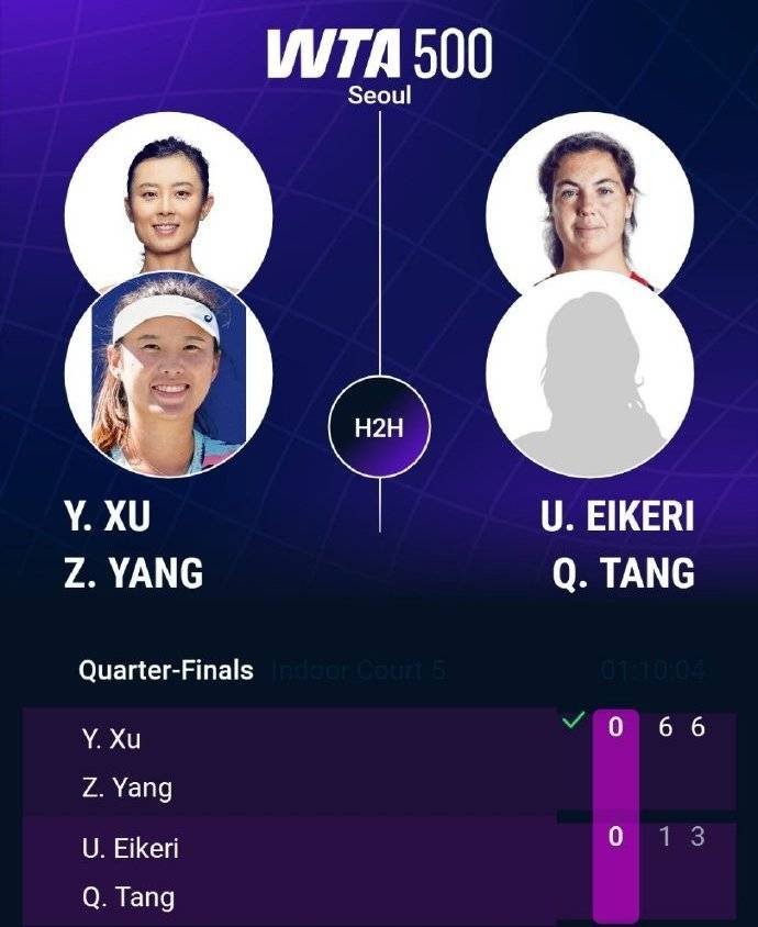 我们再来关注WTA500首尔站的比赛。在一场双打1/4决赛,中国金花组合徐一璠/杨钊煊以6-1 6-3击败艾克里/汤千慧,晋级四强。