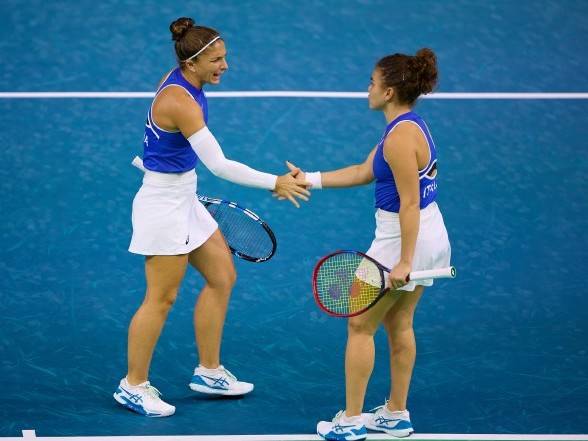 另外,在中国深圳举行的比利-简-金杯决赛圈的比赛昨晚决出了首个决赛队伍。卫冕冠军意大利队依靠埃拉尼/鲍里妮在决胜场中以6-2 6-3击败乌克兰队的科斯秋克/L-奇琴诺克,大比分2-1逆转取胜,再度晋级决赛。在这场较量中,乌克兰队的科斯秋克和小白菜斯维托丽娜在比赛中都遭遇现场观众的嘘声,还有观众打出了“烂白菜”的标语,显然对乌克兰人仍有敌意。